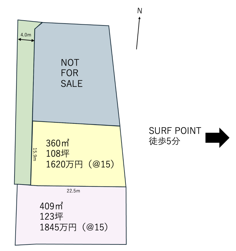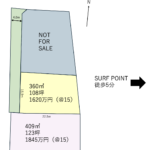 | 土地・建物説明 | サンライズPまで徒歩5分。分譲地なので新設される道路に面し水道は引込み予定。専用通路の奥なので日当たりの良い庭はプライベートな空間に!仲間とサーフィン、家族はBBQ、愛犬はドッグランなどなど。遊び方楽しみ方は無限大! |